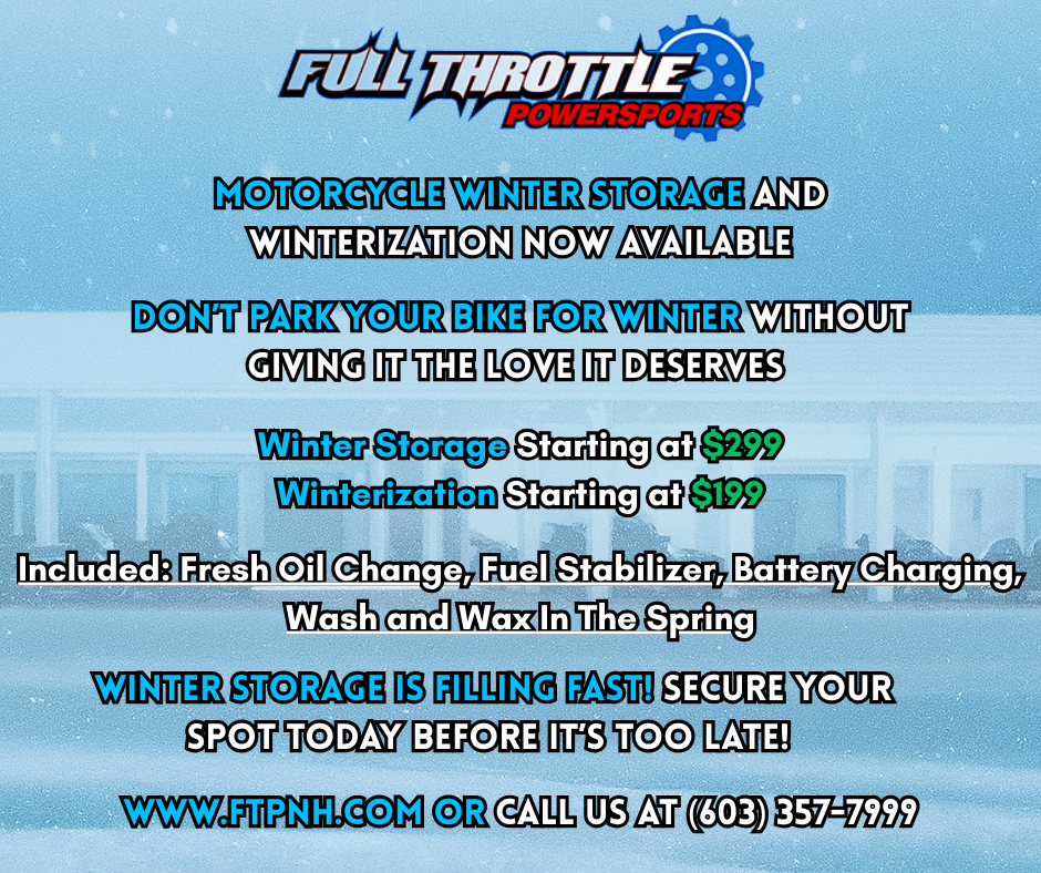Full Throttle Powersports is now offering secure indoor motorcycle winter storage from October 31 to May 1. Starting at just $299, our storage options are designed to keep your bike protected, maintained, and ready to ride when spring returns.